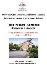 Incontri del tutorato didattico per il Corso di Laurea in Storia e Filosofia, finalizzati all'orientamento e al supporto per la stesura della Tesi di Laurea, che si terranno dalle 15:00 alle 16:00 presso l'aula S di Fieravecchia.